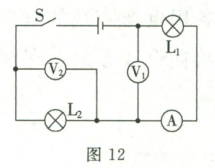 13. 如图 12 所示,已知电源电压为 9 V,电压表 $V_1$、$V_2$ 的规格相同,闭合开关 S,电压表 $V_1$ 的示数为 6 V,通过灯泡 $L_2$ 的电流为 0.5 A。