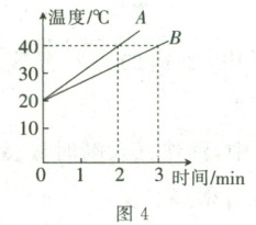 8. 为比较不同物质吸热本领,某小组分别在相同容器中加入质量均为100 g的水和食用油,并用相同加热器进行加热。不考虑热损失,且水和食用油在相同时间内吸收的热量相等,测得它们的温度随时间变化的图像如图4所示。已知$c_{水}=4.2×10^{3} J/(kg· ^{\circ}C)$。