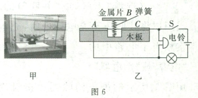 10. 图6甲展示的是一种具有报警功能的文物展示台,若其内部电路结构如图6乙所示,开关S处于闭合状态时,文物放置在金属片B上,弹簧处于压缩状态,金属片B与A、C接触。当文物被搬离展示台时(