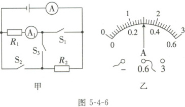 14. 如图5-4-6甲所示的电路,已知$R_1$的阻值是$20\ \Omega$,闭合开关$S_1$和$S_2$,断开开关$S_3$,电流表$A$的示数为$0.9\ \mathrm{A}$,电流表$A_1$的示数如图5-4-6乙所示。