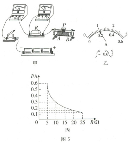 (1)该实验小组设计了如图 5 甲所示的电路,电源为三节新干电池,此实验中滑动变阻器的作用是保护电路和。
