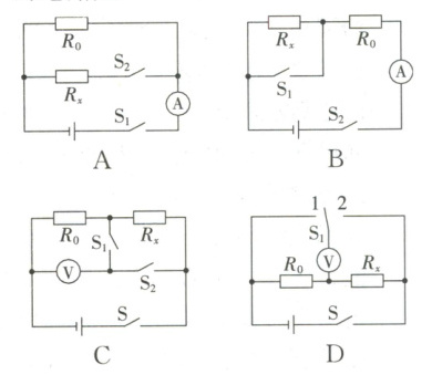 9.(多选)某同学设计了四种电路,其中电源电压不变且未知,$R_0$是已知阻值的定值电阻。在实验中不拆改线路的情况下,能够测量出未知电阻$R_x$阻值的电路是(