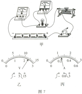 14.图 7 甲所示的是某同学“测量小灯泡电阻”的实物电路。已知电源电压恒为 6 V,小灯泡标有“3.8 V”字样,闭合开关,移动滑动变阻器滑片至某一位置时,电压表和电流表的示数分别如图 7 乙、丙所示。