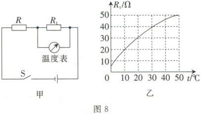 15.测温模拟电路如图 8 甲所示,温度表由测量范围为 0~3 V 的电压表改装而成,电源电压$U$为 6 V,$R$的阻值为$40\ \Omega$,热敏电阻$R_t$的阻值随温度$t$变化的关系如图 8 乙所示。