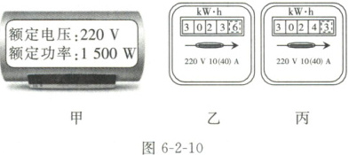 4. 小明利用电能表测量电热水器的实际功率来判断家里的电压是否正常。他把一台如图6-2-10甲所示的电热水器单独接入家庭电路中,在8:00时电能表表盘示数如图6-2-10乙所示,在8:30时电能表表盘示数如图6-2-10丙所示。这段时间内电热水器消耗的电能为