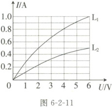 5. 有分别标有“6 V 6 W”字样和“6 V 3 W”字样的$L_1$、$L_2$两只灯泡,经实验测得它们的$I-U$特性曲线如图6-2-11所示。现将$L_1$、$L_2$两灯串联在8 V的电源上,两只灯泡消耗的总功率是