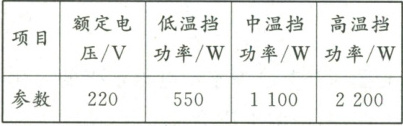 (1)由P=UI得,中温挡电流$I=\frac{P_{中}}{U}=\frac{1100W}{220V}=5A$。