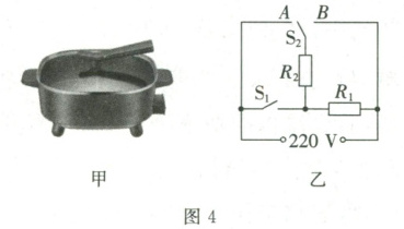 4. 周末,小杰妈妈在超市买了一个电煮锅(图 4 甲),图 4 乙为该电煮锅的简化电路图,其中开关 $S_2$ 为单刀双掷开关,$R_1$ 和 $R_2$ 都是用于加热的定值电阻,电煮锅的部分参数如下表所示。
