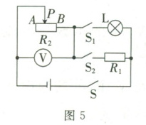 5. 如图 5 所示,电源电压保持不变,灯泡上标有“$12\ V\ 6\ W$”字样,定值电阻 $R_1=120\ \Omega$,滑动变阻器 $R_2$ 上标有“$50\ \Omega\ 1\ A$”字样,电压表的测量范围选用 $0\sim3\ V$,断开 $S_2$,闭合 $S$ 和 $S_1$,滑片 $P$ 移到 $B$ 端,灯泡刚好正常发光。
