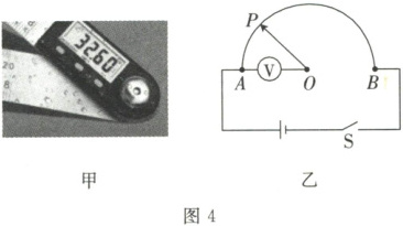 4. 图 4 甲、乙分别是创新实验小组的同学设计的一款电子量角器的实物图和电路图,其中 $AB$ 为均匀半圆弧形电阻,$O$ 点为其圆心,$OP$ 为金属滑片,可绕 $O$ 点转动,$AO$ 间连接的角度显示器是由电压表改装而成的,可用来显示$\angle AOP$的大小。当滑片 $P$ 沿顺时针方向转动时,则(