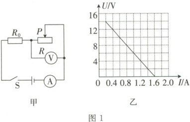 1. 如图 1 甲所示的电路,$R_0$ 为定值电阻,$R$ 为滑动变阻器,电源电压保持不变。闭合开关 $S$ 后,滑片 $P$ 从右端移动到左端的过程中,电压表示数 $U$ 与电流表示数 $I$ 的关系图像如图 1 乙所示。$R_0$ 的阻值为