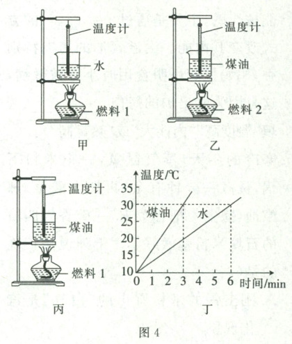 (选填“加热时间”或“温度计示数变化”)来比较物质吸收热量的多少。经过实验得出了水和煤油的温度随时间变化的图像,如图 4 丁所示,根据图丁可判断出水