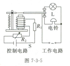 9. 图7-3-5所示的是某仓库的温度报警电路。$R_1$为热敏电阻,其阻值随温度的变化而变化,$R_2$为可调电阻。温度正常时指示灯发光,当温度升高到报警温度时,指示灯熄灭,铃响报警。下列判断正确的是(