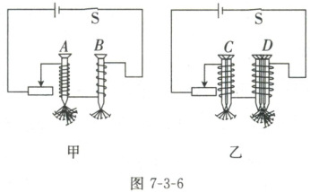 为了验证猜想,他们准备的实验器材有:新干电池2节、相同的大铁钉若干、大头针若干、长导线1根、细线若干。用其中2个大铁钉绕成电磁铁A和B,电路如图7-3-6甲所示。请你完成下列习题。
