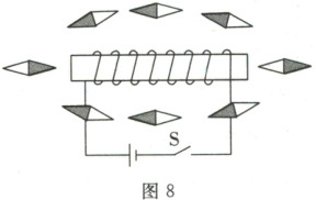 (1) 把小磁针放在螺线管四周不同的位置,通电后发现小磁针的指向如图 8 所示,说明通电螺线管周围的磁场跟