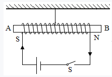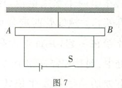 10. 用细线将一个通电螺线管 $AB$ 悬挂起来,如图 7 所示。闭合开关,最后静止时 $A$ 端指南,$B$ 端指北。画出螺线管上导线环绕图示,并标出通电螺线管的 $N$、$S$ 极。