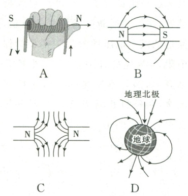 D.地球是一个巨大的磁体,地磁的南极在地理的北极附近,地磁的北极在地理的南极附近,在地球外部,磁感线从地磁的北极(地理南极附近)出发,回到地磁的南极(地理北极附近),D图磁感线方向标注正确。