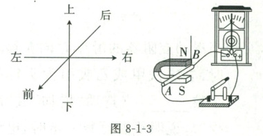 6.(多选)如图8-1-3所示,小延和小庆利用蹄形磁铁、灵敏电流计、开关、导体$AB$和若干导线等器材来探究感应电流产生的条件。闭合开关,他们进行实验,让导体$AB$在磁场中运动。下列说法正确的是(