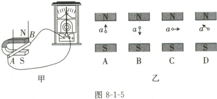 8.小滨同学用如图8-1-5甲所示的装置探究什么情况下磁可以生电。在蹄形磁铁的磁场中放置一根导线,导线两端跟灵敏电流计连接组成闭合回路。