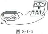 (填标号)。(3)图8-1-6所示的是小芳探究“什么情况下磁可以生电”的实验装置,$ab$是一根直铜丝,通过导线与电流表的“$3$”“—”两接线柱相连。当使$ab$迅速向右运动时,并未发现电流表指针有明显偏转,最有可能的原因是