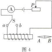 7. 如图4所示的电路,小磁针静止时,$A$端是