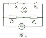 3. 如图1所示,当闭合开关$S_1$、$S_2$,且甲、乙均为电压表时,甲、乙两表示数之比为$5:2$,则两电阻$R_1$、$R_2$的阻值之比为