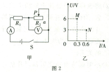 4. 如图2甲所示,电源电压不变,闭合开关$S$,将滑动变阻器滑片$P$分别位于最右端$a$处和其上某处$b$(图中未标出),记录两次电表数据并标于图2乙中$M$、$N$两点处,则滑动变阻器的最大阻值是