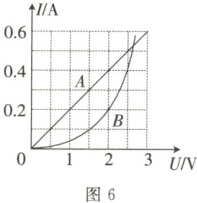 9. 两个电路元件$A$和$B$的$I-U$图像如图6所示。根据图像,下列说法正确的是(