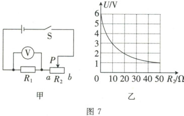 10. 在如图7甲所示的电路中,当滑动变阻器$R_2$的滑片$P$在$a$端和$b$端之间移动时,定值电阻$R_1$两端的电压也随之变化。图7乙所示的是$R_1$两端的电压$U$随$R_2$的阻值变化的关系图像。下列说法错误的是(