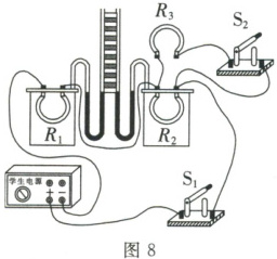 11. 图8所示的是探究电流热效应的实验装置,两个相同透明容器中密封着等量的空气和电阻$R_1$、$R_2$,其中$R_1=5\ \Omega$,$R_2=R_3=10\ \Omega$。下列说法错误的是(