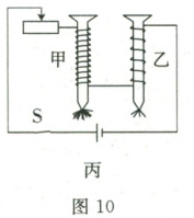 方向有关。(3)如图10丙所示,电磁铁磁性强弱与