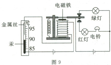12. 图9所示的是一种温度自动报警器的原理图。当温度达到$92° C$时,关于该报警器,下列说法正确的是