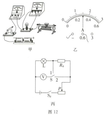 (1)用笔画线代替导线将图12甲的电路补充完整。(要求:向左移动滑动变阻器的滑片时,电流表示数变小;导线不得交叉)