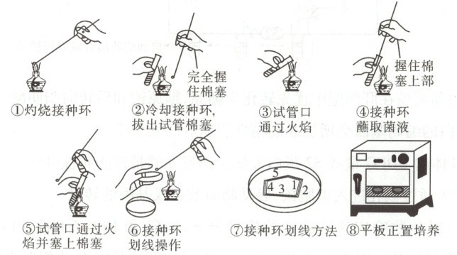 解题思路:由题可知,②中拔出棉塞后应握住棉塞上部;⑥中划线时不能将培养皿的皿盖完全打开,应在火焰附近将皿盖打开一条缝隙;⑦中划线时第5次的划线不能与第1次的划线相连;⑧中平板应倒置培养。①③④⑤正确,故选D。