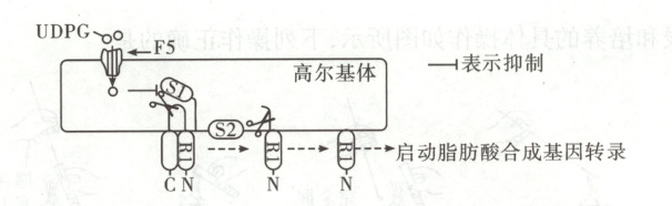解题思路:由题干信息可知,糖原合成的中间代谢产物UDPG进入高尔基体后,会抑制S1蛋白水解酶的活性,而蛋白R1需要经过S1和S2蛋白水解酶酶切后才被激活,进而启动脂肪酸合成基因的转录,据此可知,糖原合成的中间代谢产物UDPG可抑制脂肪酸的合成,因此体内多余的葡萄糖在肝细胞中优先转化为糖原,糖原饱和后转向脂肪酸合成,A正确。由题干信息可知,UDPG通过膜转运蛋白F5进入高尔基体,抑制S1蛋白水解酶的活性,进而抑制脂肪酸的合成,因此敲除F5蛋白的编码基因会促进脂肪酸的合成,进而增加非酒精性脂肪肝的发生率,B正确。由B项分析可知,UDPG进入高尔基体不利于脂肪酸的合成,降低高尔基体中UDPG含量会促进脂肪酸的合成,从而会诱发非酒精性脂肪性肝病;蛋白R1经S1、S2蛋白水解酶酶切后被激活,进而启动脂肪酸合成基因的转录,故S2蛋白失活会抑制脂肪酸的合成,不会诱发非酒精性脂肪性肝病。C错误。转录发生在真核细胞的细胞核中,因此激活后的R1可通过核孔进入细胞核,启动脂肪酸合成基因(核基因)的转录,D正确。