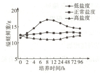 解题思路:分析图中曲线,在低盐度条件下,缢蛏鲜重先增大后减小,后趋于稳定,说明缢蛏在低盐度条件下先吸水,后失水直至趋于动态平衡,A正确;低盐度培养时,缢蛏组织渗透压大于外界环境,导致缢蛏吸水,鲜重增加,为恢复正常状态,缢蛏通过自我调节使组织中的溶质含量减少,从而降低组织渗透压,引起组织失水,因此在低盐度培养8 - 48h,缢蛏通过自我调节以减少组织中的溶质含量,B错误;组织渗透压的高低与其中的溶质含量有关,溶质越多,渗透压相对越高,因此,相同盐度下,游离氨基酸含量高的组织渗透压也高,C正确;细胞呼吸过程中产生的中间产物可转化为氨基酸、甘油等非糖物质,由此推测缢蛏组织中游离氨基酸含量的变化与细胞呼吸有关,D正确。