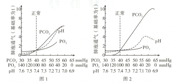 解题思路:根据图1分析,一定范围内,增加PCO₂、H⁺浓度及降低PO₂均能增大肺泡通气,增强呼吸运动,A错误;与图1相比,图2的pH由7.4下降至7.1的过程中的肺泡通气增大的幅度减小,而图1中pH由7.4下降到7.1的过程PCO₂和PO₂保持正常,图2中pH由7.4下降到7.1的过程对PCO₂和PO₂不加控制,推测pH由7.4下降到7.1的过程中PCO₂下降,从而使肺泡通气相对于PCO₂和PO₂保持正常时减小,B正确;与图1相比,图2的PO₂由60 mmHg下降至40 mmHg的过程中的肺泡通气增大的幅度减小,推测PO₂由60 mmHg下降至40 mmHg的过程中PCO₂和H⁺浓度逐渐降低,从而使肺泡通气相对于PCO₂和pH保持正常时减小,C正确;CO₂作用于相关感受器,通过神经调节对呼吸运动进行调控,D错误。