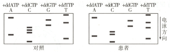 15. 最早的双脱氧测序法是在PCR反应体系中,分别再加入一种少量的双脱氧核苷三磷酸(ddATP、ddCTP、ddGTP或ddTTP),子链延伸时,双脱氧核苷三磷酸也遵循碱基互补配对原则,以加入ddATP的体系为例:若配对的为ddATP,延伸终止;若配对的为脱氧腺苷三磷酸(dATP),继续延伸;PCR产物变性后电泳检测。通过该方法测序某疾病患者及对照个体的一段序列,结果如图所示。下列叙述正确的是(