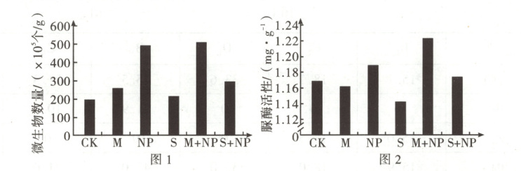 20. (11分)土壤中的微生物数量与脲酶活性可反映土壤的肥力状况。为研究不同施肥方式对土壤微生物数量和脲酶活性的影响,试验分组如下:不施肥(CK)、有机肥(M)、化肥(NP)、麦秸还田(S)、有机肥+化肥(M+NP)、麦秸还田+化肥(S+NP),其中,NP中氮肥为尿素,麦秸未经处理直接还田,结果如图所示。回答下列问题: