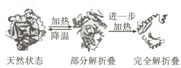 解题思路 由题干“部分解折叠后可被正常碱性蛋白酶特异性识别并降解(自溶)失活”可知,碱性蛋白酶在一定条件下可发生自溶失活,A正确;由图可知,加热导致碱性蛋白酶的结构由天然状态变为部分解折叠,部分解折叠的碱性蛋白酶降温后可恢复到天然状态,因此加热导致碱性蛋白酶构象改变是可逆的,B错误;碱性蛋白酶受到其他成分的影响而改变构象,而且加热也能使碱性蛋白酶失活,导致加碱性蛋白酶的洗涤剂的去污效果降低,添加酶稳定剂可提高加碱性蛋白酶的洗涤剂的去污效果,C正确;酶具有高效性,碱性蛋白酶具有很强的分解蛋白质的能力,能将血渍、奶渍等含有的大分子蛋白质水解成可溶性的氨基酸或小分子的肽,使污迹容易从衣物上脱落,添加碱性蛋白酶可降低洗涤剂使用量,使洗涤剂朝低磷、无磷的方向发展,减少对环境污染,D正确。