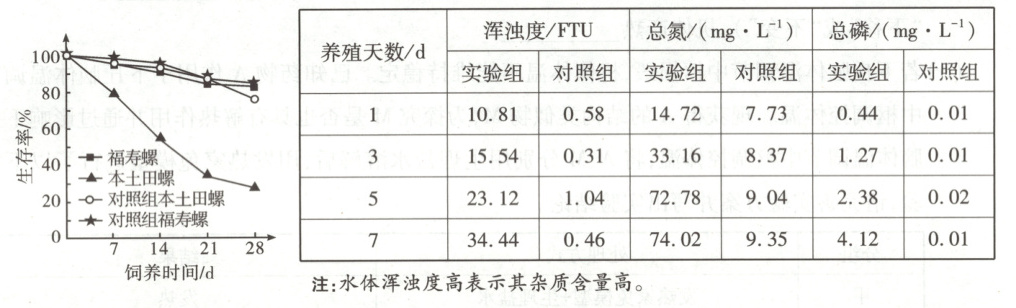 20. (9分)入侵生物福寿螺适应能力强、种群繁殖速度快。为研究福寿螺与本土田螺的种间关系及福寿螺对水质的影响,开展了以下实验: