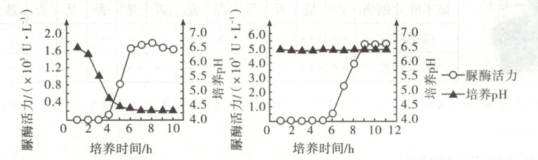 (答出两种即可)。(3)研究人员利用脲酶基因构建基因工程菌L,在不同条件下分批发酵生产脲酶,结果如图所示。推测