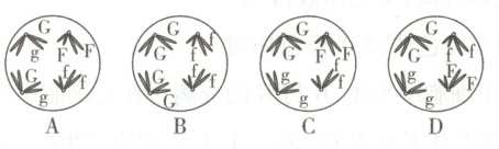 解题思路 题图中4个细胞示意图均含同源染色体,且同源染色体分离并移向细胞两极,其时期应为减数分裂Ⅰ后期,等位基因G/g和F/f分别位于两对同源染色体上,在不考虑基因突变的情况下,若不发生互换,G基因和F基因所在染色体移向细胞同一极时,其细胞分裂示意图应为图C;G基因和f基因所在染色体移向细胞同一极时,其细胞分裂示意图应为图D。若基因G/g所在同源染色体的非姐妹染色单体发生了互换,其细胞分裂示意图可为图A。该时期细胞中不会出现4个G基因和4个f基因。故选B。