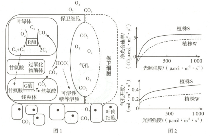 2. [2025·陕西卷,17T,10分] 叶绿体中R酶既能催化CO₂固定,也能催化C₅与O₂反应,CO₂和O₂两种底物竞争R酶同一活性位点;线粒体中G酶参与催化甘氨酸转化为丝氨酸,如图1。为探究保卫细胞中G酶对植物光合作用的影响,研究者以野生型植株W为参照,构建了G酶表达量仅在保卫细胞中增加的植株S,实验结果如图2。请回答下列问题: