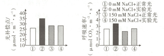 1. [2025·河南卷,17T,10分] 光质和土壤中的盐含量是影响作物生理状态的重要因素。为探究不同光质对高盐含量(盐胁迫)下某作物生长的影响,将作物分组处理一段时间后,结果如图所示(光补偿点指当总光合速率等于呼吸速率时的光照强度)。请回答下列问题: