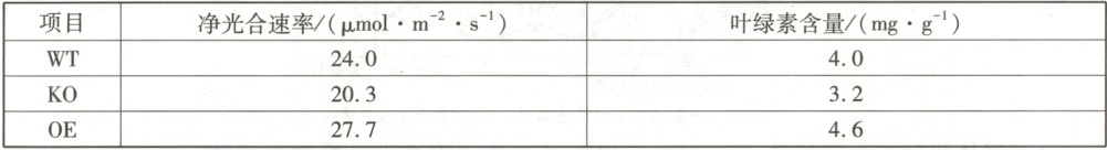 5. [2024·安徽卷,16T,11分]为探究基因OsNAC对光合作用的影响,研究人员在相同条件下种植某品种水稻的野生型(WT)、OsNAC敲除突变体(KO)及OsNAC过量表达株(OE),测定了灌浆期旗叶(位于植株最顶端)净光合速率和叶绿素含量,结果见表。请回答下列问题: