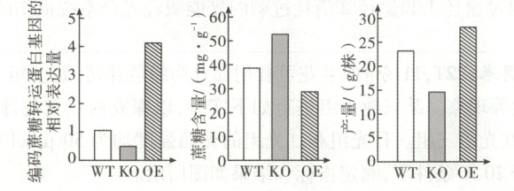 (3)增大 ①与WT组相比,OE组叶绿素含量较高,增加了对光能的吸收、传递和转换,光反应增强,促进了旗叶的光合速率 ②与WT组相比,OE组旗叶中编码蔗糖转运蛋白基因的相对表达量较高,可以及时将更多的光合产物(蔗糖)向外运出,从而促进旗叶的光合速率