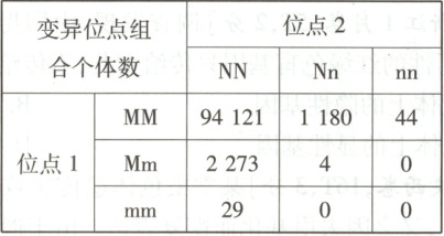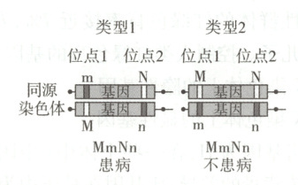 5. [2025·广东卷,16T,4分]若某常染色体隐性单基因遗传病的致病基因存在两个独立的致病变异位点1和2(M和N表示正常,m和n表示异常),理论上会形成两种变异类型且效应不同(如图),但仅凭个体的基因检测不足以区分这两种变异类型。通过对人群中变异位点的大规模基因检测,有助于该遗传病的风险评估。如表为某人群中这两个变异位点的检测数据。下列对该人群的推测,合理的是(