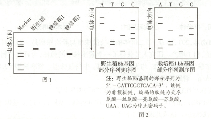 。(3)科研小组采用PCR技术,扩增出野生稻和栽培稻Bh/bh基因的片段,电泳结果见图1。