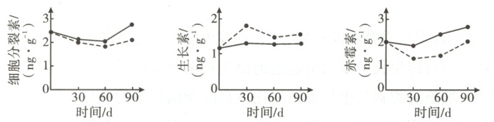 6. [2025·广东卷,15T,4分]某高校科技特派员为协助种养专业合作社繁殖优良欧李种质,以欧李根状茎为插条,用赤霉素合成抑制剂S₃₃₀₇处理,使插条生根率由22%提高到78%。扦插后,插条的几种内源激素的含量变化见图。下列叙述错误的是